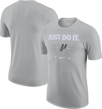 The Nike Silver San Antonio Spurs Just Do It T-shirt is the ultimate way to showcase your unwavering support for the San Antonio Spurs. Crafted from soft cotton, this crew neck tee boasts screen-printed graphics that proudly display the Spurs logo and the iconic "Just Do It" slogan. Whether you're cheering from the stands or simply flaunting your team spirit, this t-shirt is a must-have for any Spurs fan.