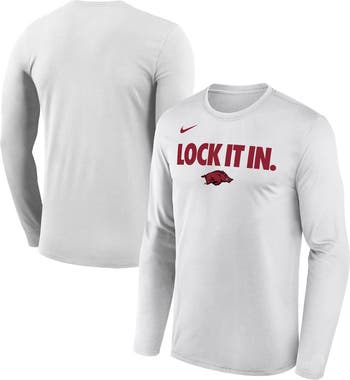 Dribble past the competition in this Arkansas Razorbacks On-Court Bench Long Sleeve T-Shirt from Nike. Matching what the players on the bench will wear during the 2026 NCAA Basketball season, this tee features a "Lock It In" wordmark across the chest with the Arkansas Razorbacks logo underneath. With Dri-FIT technology to wick away sweat and a lightweight, breathable build, you'll be able to hit the gym or enjoy even the most intense matches while staying cool and comfortable.