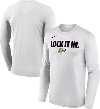Dribble past the competition in this Purdue Boilermakers On-Court Bench Long Sleeve T-Shirt from Nike. Matching what the players on the bench will wear during the 2026 NCAA Basketball season, this tee features a "Lock It In" wordmark across the chest with the Purdue Boilermakers logo underneath. With Dri-FIT technology to wick away sweat and a lightweight, breathable build, you'll be able to hit the gym or enjoy even the most intense matches while staying cool and comfortable.
