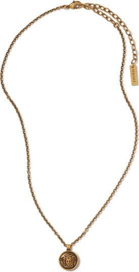 An aged finish enhances the antique-inspired aesthetic of this Medusa pendant necklace.