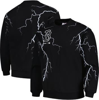 The PLEASURES Black Boston Red Sox Lightning Crewneck Pullover Sweatshirt is a must-have for devoted Boston Red Sox fans. Perfect for moderate temperatures, this midweight sweatshirt proudly displays screen-printed graphics showcasing your allegiance to the team. Rib-knit elastic cuffs, collar, and hem ensure a comfortable fit, making it ideal for cheering from the stands or anywhere else.
