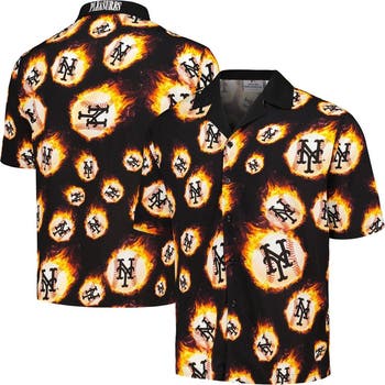 The Men's PLEASURES Black New York Mets Flame Fireball Button-Up Shirt is a must-have for any true New York Mets fan. With its sublimated graphics, this shirt is sure to turn heads and show your support for the team. Made from soft rayon, this shirt is comfortable to wear all day long, whether you're at the game or just cheering from home.
