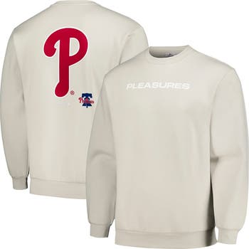 The Men's PLEASURES Gray Philadelphia Phillies Ballpark Pullover Sweatshirt is the perfect way to show your support for the Philadelphia Phillies. Made from a comfortable cotton and polyester blend, this midweight sweatshirt features a fleece lining for added warmth during chilly game days. Low puff screen print graphics proudly display your allegiance, while the oversized fit provides a relaxed and comfortable feel. Whether you're cheering from the stands or simply showing your support, this sweatshirt is the perfect way to represent the Philadelphia Phillies in style.