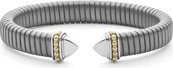Contrasting 18-karat-gold Caviar beading frames the domed ends of this artfully grooved sterling silver cuff bracelet.