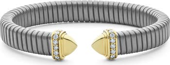 Diamonds and 18-karat gold light up the domed ends of this artisanally grooved titanium cuff bracelet.