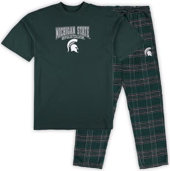 The Men's Profile Green Michigan State Spartans Big & Tall 2-Pack T-Shirt & Flannel Pants Set is the ultimate wardrobe staple for any devoted Michigan State Spartans fan. This set includes a comfortable T-shirt and flannel pants, both adorned with distressed screen print graphics and embroidered fabric appliques that proudly display your Spartans allegiance. The pants feature two side pockets and an elastic waistband with a drawstring for a secure and adjustable fit, while the T-shirt's classic crew neck design ensures a comfortable fit. Whether you're cheering from the stands or simply showing your support, this set is the perfect way to represent the Michigan State Spartans in style.