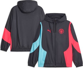 Combine style and function in one piece of game day outerwear with this Manchester City 2023/24 Pre-Match Anthem jacket from Puma. This extra layer has a full-zip construction for easy adjustments, and the drawstring hood allows for additional coverage when necessary. Complete with detailed Manchester City graphics, this jacket is the perfect way to highlight your favorite Premier League squad.