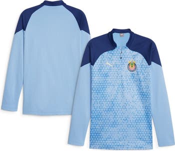 Represent your beloved Chivas with the Men's Puma Light Blue Chivas 2023/24 Quarter-Zip Fleece Top. This pullover features screen print Chivas graphics and a fleece lining to keep you warm and comfortable. The invisible zipper and mock neck add a touch of style, while the raglan sleeves provide a comfortable fit. Whether you're at the Estadio Akron or watching from home, this pullover will keep you warm and stylish while you cheer on your favorite team.