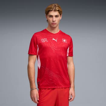 Get ready to cheer on your favorite soccer squad! This Switzerland National Team 2026 Home Replica Jersey replicates the jersey worn by the players during the 2025/26 season. This jersey is made with dryCELL technology, which draws sweat away from the skin to keep you dry and comfortable. Featuring an embroidered team graphic at the left chest and a sublimated pattern, this crew neck jersey is made of at least 95% recycled material as part of the Puma RE:FIBRE program.