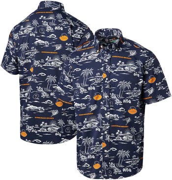 Celebrate your unwavering support for the Chicago Bears with the Reyn Spooner Navy Chicago Bears Throwback Kekai Print Button-Up Shirt. This stylish button-up features an allover sublimated design, showcasing the iconic Chicago Bears logo and vibrant Kekai print. Its quick-dry technology and two-way stretch fabric ensure comfort and mobility, while the rounded droptail hem adds a touch of sophistication. Whether you're cheering from the stands or representing your team off the field, this shirt is the perfect way to show your Chicago Bears pride.