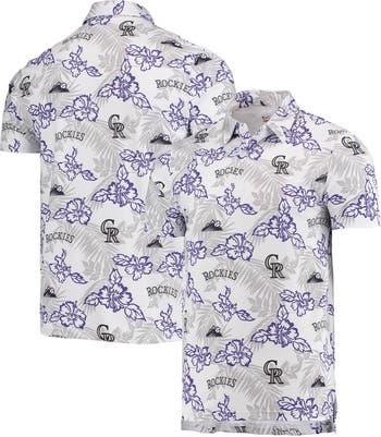 Step into the world of baseball with the Men's Reyn Spooner White Colorado Rockies Performance Polo. This stylish polo, adorned with printed allover graphics, embodies the spirit of the Rockies. Its droptail hem with side splits adds a touch of flair, while the three-button placket ensures a secure fit. Whether you're cheering from the stands or simply showing your support, this polo is the perfect way to represent your love for the Colorado Rockies.