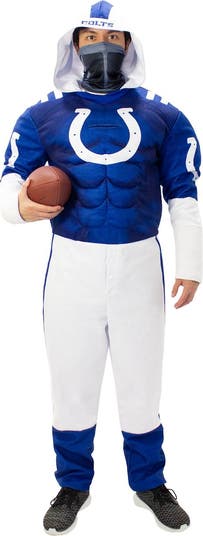 Transform into an Indianapolis Colts player with this Game Day costume in team colors. The bodysuit features padded faux muscles, official Indianapolis Colts graphics and a zipper closure for easy dressing. Plus, polyester material creates a soft feel for hours of comfortable wearing.