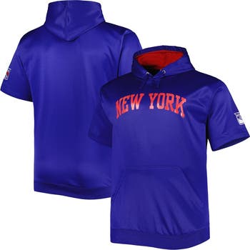The Men's Royal New York Rangers Big & Tall Logo Short Sleeve Hoodie is the perfect way to show your support for the New York Rangers. This midweight hoodie is made of soft polyester and features an embroidered team logo and screen print graphics. The front pouch pocket is perfect for storing your essentials, and the fleece lining will keep you warm on chilly days. Whether you're cheering on the Rangers at the game or just relaxing at home, this hoodie is a must-have for any fan.
