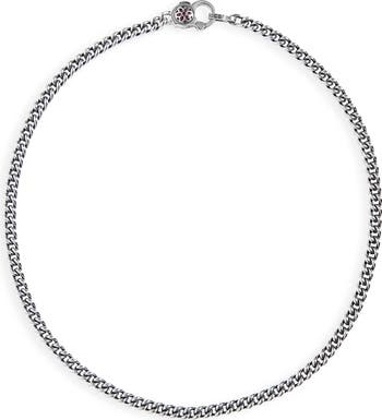 The label's signature filigree rosette set with ruby gems details the unique Model 9 clasp of this curb-chain necklace handcrafted of sterling silver.