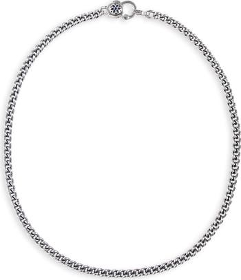 The label's signature filigree rosette set with sapphire gems details the unique Model-9 clasp of this curb-chain necklace handcrafted of sterling silver.