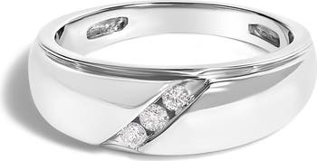 Crafted from exceptional .925 sterling silver with a rhodium plating for enhanced shine and durability, this exquisite men's ring signifies both strength and elegance. Its polished, smooth band conveys a modern sophistication, while three channel-set natural diamonds dazzle diagonally across its face. Each diamond, sparkling with an H-I color rating and I1-I2 clarity, adds a refined glimmer that catches the light, emblematic of your enduring grace and poise. Designed for comfort yet radiating luxury, this sleek adornment is ideal for the discerning gentleman keen on blending classic charm with contemporary style.