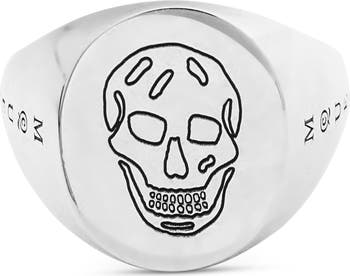 McQueen's macabre edge reigns supreme in this signet ring engraved with a signature skull and flanked with logo lettering.