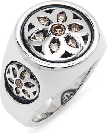 The label's mission to bring art and beauty to your wardrobe continues with this sterling silver ring featuring signature rosettes set with brown diamonds.
