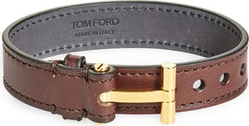 Signature T hardware serves as the adjustable buckle that secures this smooth leather bracelet with gleam.