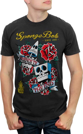- Life's better when you’re a little bit square and wearing this men's t-shirt that is perfect for every occasion! Featuring a fun tattoo-inspired design of SpongeBob and Patrick's iconic skeletons surrounded by roses and the heartwarming phrase: "Friends Til the End" and "SpongeBob Since 1999" printed across the front.