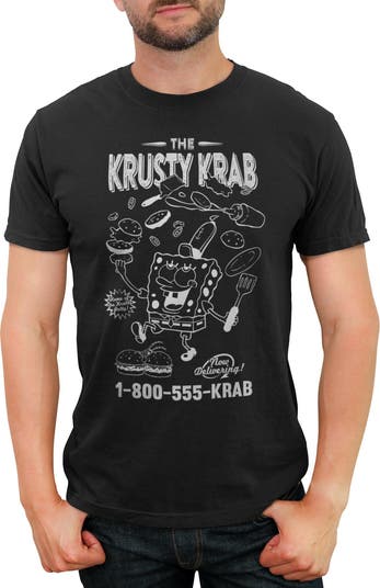 - Life's better when you’re a little bit square and wearing this men's t-shirt that is perfect for every occasion! Featuring a white design of the lovable SpongeBob showing off his cooking skills, along with the text: "The Krusty Krab Now Delivering!" and "1-800-555-Krab" across the front.