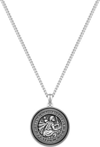 Saint Christopher serves as a symbol of protection on this circular pendant necklace rendered in sterling silver with rhodium plating.