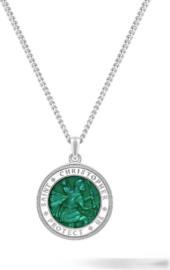 Saint Christopher serves as a symbol of protection on this circular pendant necklace rendered in sterling silver highlighted with a layer of enamel.