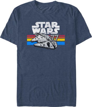 - Own the moment with this stylish new Men's Graphic T-Shirt that is perfect for every occasion! Featuring the Millennium Falcon with the number 77, the Star Wars Logo, and Vintage-inspired stripes across the background.