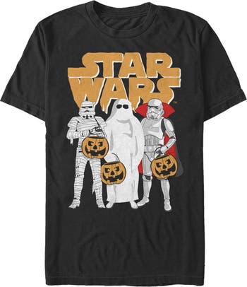 - Own the moment with this stylish new Halloween men's tee featuring three Stormtrooper soldiers dressed as a mummy, a ghost, and a vampire along with the Star Wars logo above them in orange.