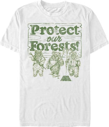 Don't let the Empire destroy the forests of Endor! Stand up to Stormtroopers with the Star Wars Ewok Protect Our Forests Men's T-Shirt. A vintage-style distressed green print reads "Protect Our Forests" above three Ewoks and the Star Wars logo printed on the front of this awesome Ewok T-shirt.