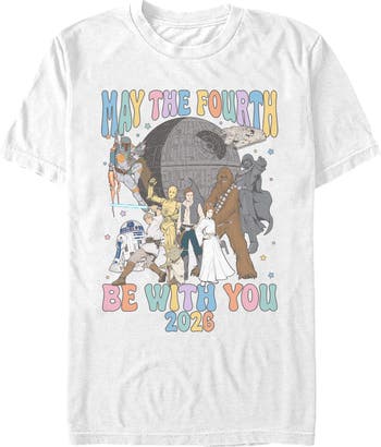 No need to keep looking for fashion help in Alderaan places! Transport yourself to a galaxy far, far away with this new Men's Star Wars May The Fourth Be 2026 Graphic T-Shirt! This tee features an awesome graphic of the iconic group of: Leia Organa, Luke Skywalker, Darth Vader, R2-D2, Chewbacca, Han Solo, C-3PO, and Boba Fett standing together in front of a Death Star and the Millennium Falcon surrounded by stars and the phrase: "May The Fourth Be With You 2026" printed in colorful lettering. Whether you’re attending a convention, hanging out with friends, or just enjoying a casual day out, don't miss out on cool Star Wars apparel. This galactic gear that celebrates the Star Wars franchise is perfect for fans everywhere!