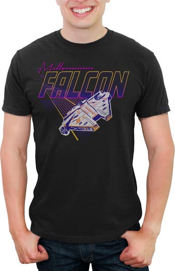 - Strut your stuff with this stylish new men's t-shirt that is perfect for every occasion! Featuring a cool, retro-style graphic of the Millennium Falcon flying across the front.