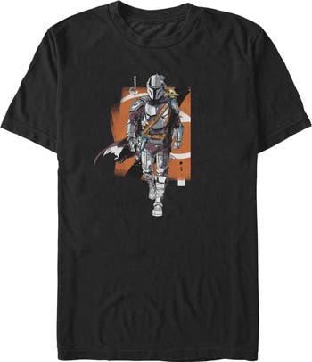 - Protect the galaxy with this men's t-shirt that will look perfect alongside the New Republic! Featuring an epic graphic of Din Djarin with Grogu holding onto his shoulder as he walks across the front.