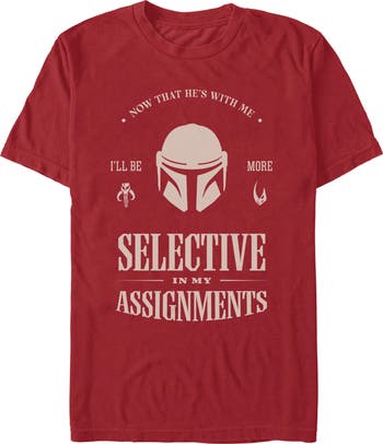 - Protect the galaxy with this men's t-shirt that will look perfect alongside the New Republic! Featuring The Mandalorian's helmet and the text "No That He's With Me, I'll Be More Selective In My Assignments" printed across the front.