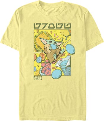 - Protect the galaxy with this men's t-shirt that will look perfect alongside the New Republic! Featuring a cute, comic-style graphic of Grogu eating a snack floating in front of food-themed panels.