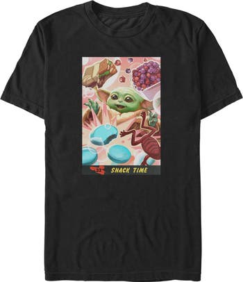 The next adventure begins! Join your favorite Mandalorian, Din Djarin, and his apprentice, Grogu, while they embark on a new, exciting Star Wars mission. This officially licensed Men's The Mandalorian & Grogu The Child Snack Time Comic Art Graphic T-Shirt features an adorable, artistic graphic of Grogu looking marveled surrounded by multiple snacks in front of a pink background with the text: "Snack Time" printed below. Hop into the Razor Crest and help The New Republic protect everything the Rebellion fights for, aiming for freedom and justice across the Galaxy.