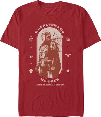 - Protect the galaxy with this men's t-shirt that will look perfect alongside the New Republic! Featuring The Mandalorian, Grogu, and the text "Whenever I Go, He Goes" printed across the front.