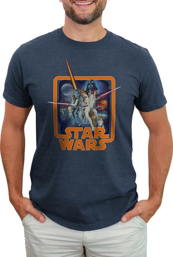 Take your wardrobe all the way back to a long time ago in a galaxy far, far away with the Star Wars Throwback Heather Navy Blue T-Shirt! The classic poster artwork from Episode IV: A New Hope is printed in a fun vintage-style on the front of this awesome navy blue Star Wars shirt.