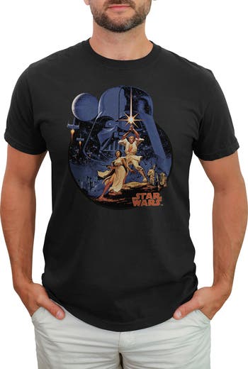 Luke Skywalker, Princess Leia, and Darth Vader all make an appearance on the Star Wars Vintage Art Black T-Shirt. This black Star Wars t-shirt features classic Star Wars artwork for a throwback look with modern appeal.