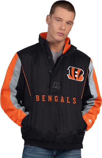 Showcase your Cincinnati Bengals pride with this Men's from Starter. The quilted lining provides warmth and comfort, while the front zipper with four-snap overlay helps to provide protection from the elements. The fabric applique team logo with embroidered detail on the front and back proudly showcases your Cincinnati Bengals pride, while the sleeve stripes and contrast-color piping add a touch of athletic flair.