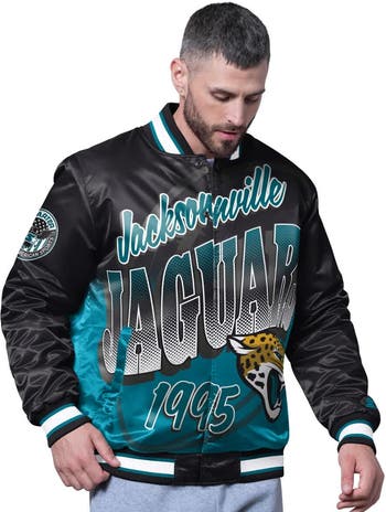 Stand up and cheer for a Jacksonville Jaguars sack in this Pass Rush Varsity Full-Snap Jacket from Starter. Designed with Starter 1980s nostalgia, this midweight jacket is perfect for moderate temperatures, offering comfort whether you're at the stadium or out for the evening. Bold, sublimated custom team graphics proudly display the established year on the front and the main logo across the back. Complete with striped, rib-knit trim for a snug fit and convenient side pockets, this jacket - finished with a twill appliqu patch on the sleeve - is the ultimate way to show your team pride on game day.