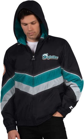 Rep your Miami Dolphins with this Starter Thursday Night Gridiron Vintage Logo Full-Zip Hoodie. This full-zip hoodie features a vintage embroidered Miami Dolphins logo and team name. Its contrast-color hood lining and striped sleeves add a unique touch to this midweight jacket.