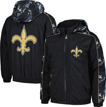 Whether it's raining, cold, or windy, this full-zip Starter Thursday Night Gridiron hoodie has you covered for game day. An unmistakable New Orleans Saints design with authentic details creates a dedicated fan look. Water-resistant fabric keeps you dry, a heavyweight construction maintains optimal warmth and elastic features offer security.