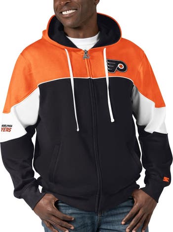 The Men's Starter Black/Orange Philadelphia Flyers Power Forward Full-Zip Hoodie is the ultimate way to show unwavering support for the Philadelphia Flyers. This midweight hoodie is perfect for moderate temperatures, featuring two front pockets for convenience and embroidered fabric appliques that proudly display the Flyers' iconic logo. The soft fleece lining ensures warmth and comfort, making it the ideal choice for cheering on your team from the stands or relaxing at home.