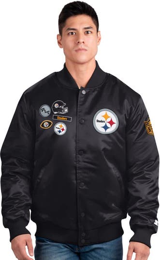Showcase your devotion to the Pittsburgh Steelers by sporting this Exclusive Satin Full-Snap Varsity Jacket from Starter. It boasts tackle twill team appliques that make your fandom undeniable and a football player caricature on the lining for a surprising detail. Satin fabric creates a lustrous finish, making this Pittsburgh Steelers jacket a statement piece.