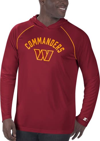The Men's Starter Burgundy Washington Football Team Raglan Long Sleeve Hoodie T-Shirt is the ultimate way to show unwavering support for the Washington Football Team. With contrast-color piping, raglan sleeves, and a rounded droptail hem, this hoodie combines style and comfort. Screen print graphics and a scuba hood without a drawstring add flair, while the durable and breathable polyester material ensures longevity. Whether cheering from the stands or showcasing team spirit, this hoodie perfectly represents the Washington Football Team.