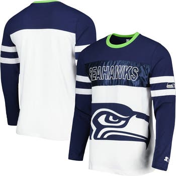 Represent your unwavering support for the Seattle Seahawks with the Men's Starter College Navy/White Seattle Seahawks Halftime Long Sleeve T-Shirt. This officially licensed NFL tee features embroidered fabric applique and screen print graphics that proudly display the Seahawks logo and team colors. The front and back yoke seams, satin inset, and sewn-on sleeve stripes add a touch of sophistication to this classic long sleeve. Whether you're cheering from the stands or simply showing your Seahawks pride, this T-shirt is the perfect way to connect with your favorite team.
