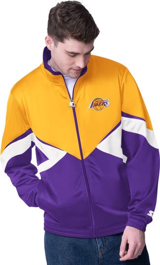 Level up your Los Angeles Lakers fandom with this Starter Rush Applique Full-Zip Track Jacket. This stylish track jacket features a bold color blocked design with white accents and embroidered Los Angeles Lakers graphics on the chest and back. The midweight construction and mock neck provide a comfortable layer of warmth, making it ideal for moderate temperatures.