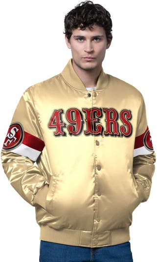 Show your dedication to the San Francisco 49ers with this Triple Option Full-Snap Varsity Jacket from Starter. This midweight jacket is perfect for moderate temperatures, ensuring you stay comfortable while showing off your team pride. The rib-knit collar, cuffs, and hem provide a secure fit, while the twill applique team wordmark at the front and logos on both sleeves make your San Francisco 49ers fandom unmistakable.