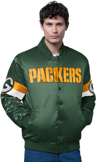 Rep your team in style with this Green Bay Packers Triple Option Satin Varsity Full-Snap Jacket from Starter. With its rib-knit standup collar, cuffs, and hem, this midweight jacket is perfectly suited for moderate temperatures. The embroidered fabric applique wordmark at the chest and team logos on both sleeves boldly declare your Green Bay Packers pride.